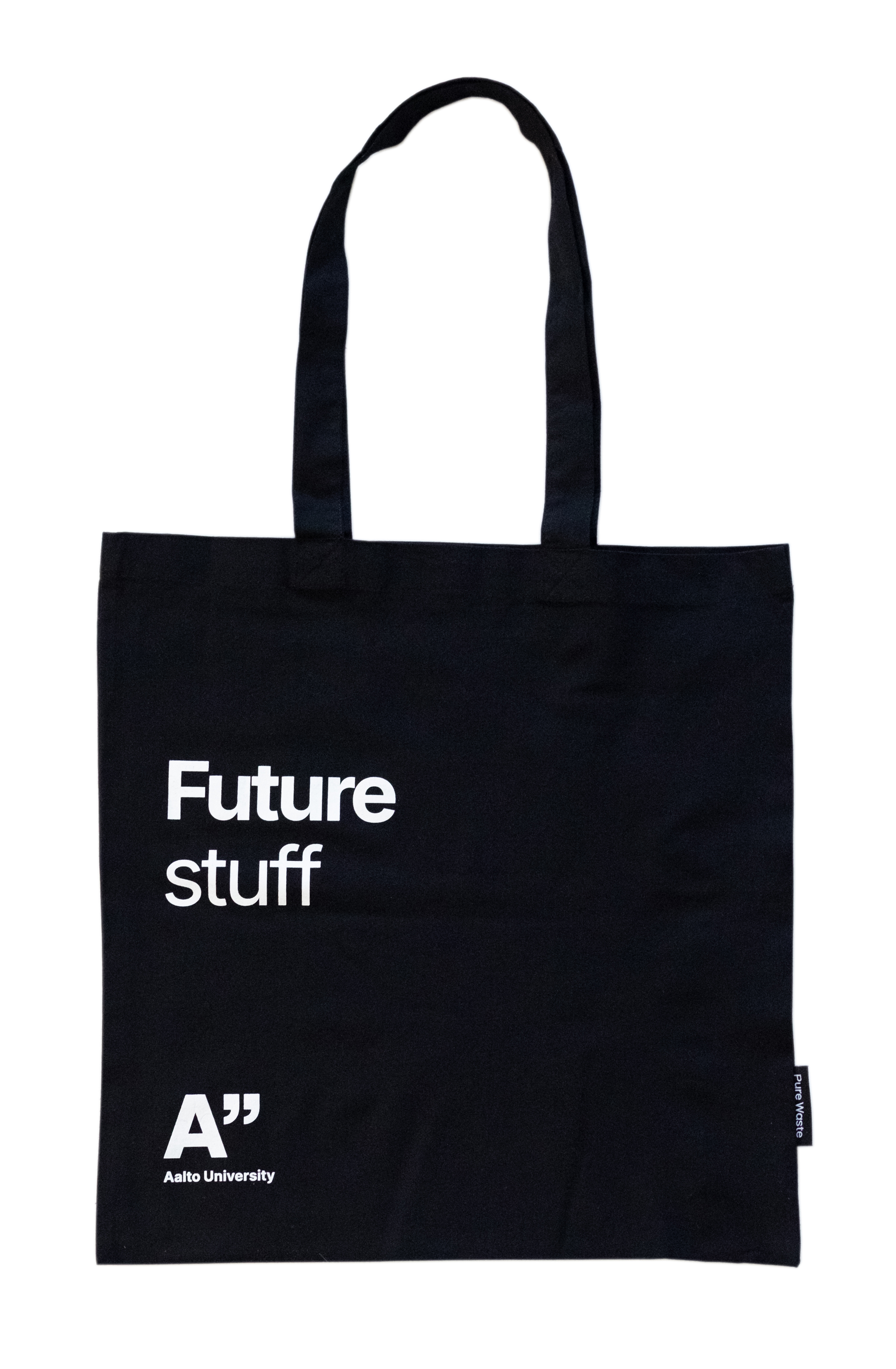 Pure Wasten musta kangaskassi, jossa valkoinen Future Stuff -printti. Kassit valmistetaan kierrätetystä ylijäämämateriaalista.
