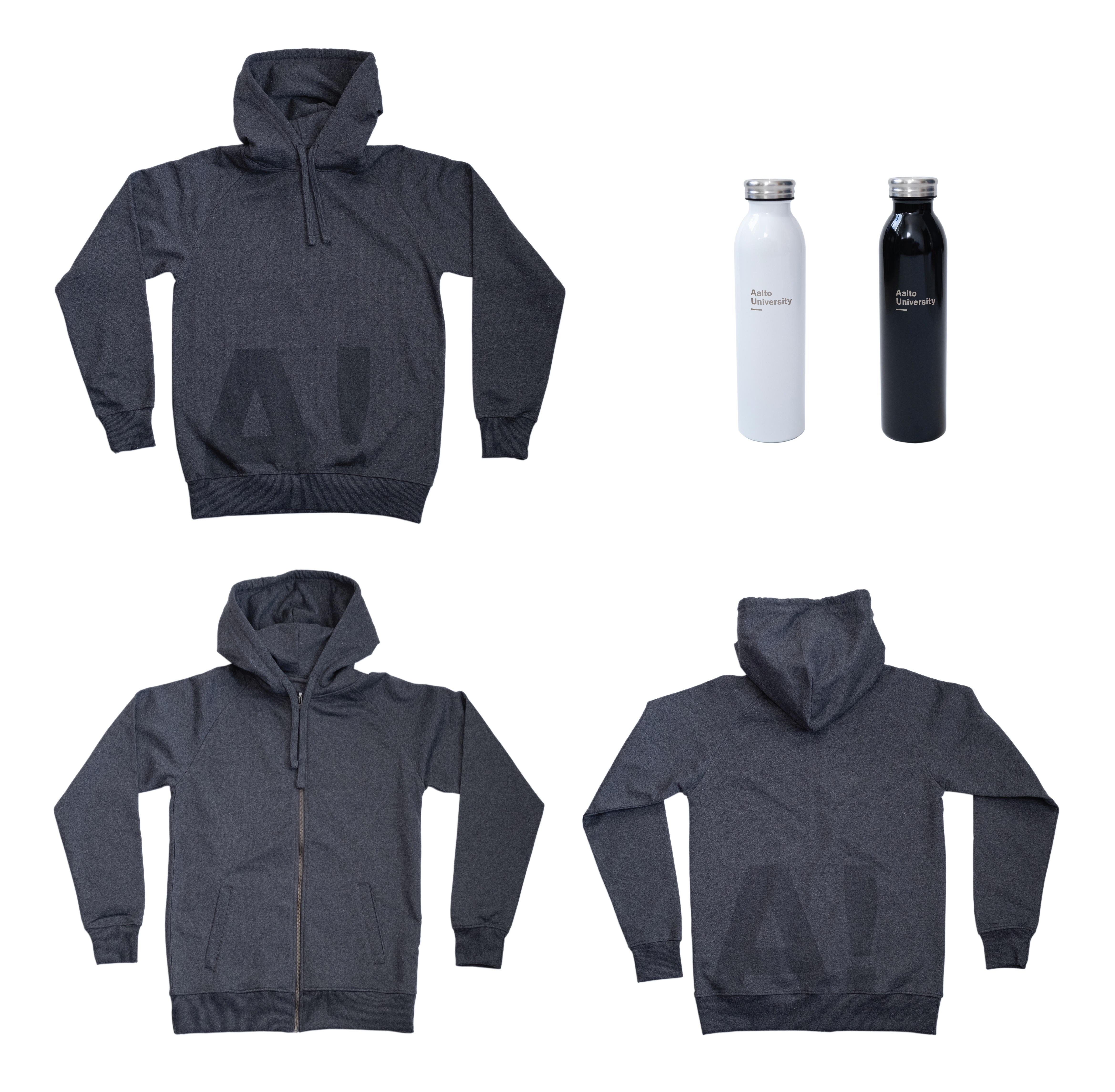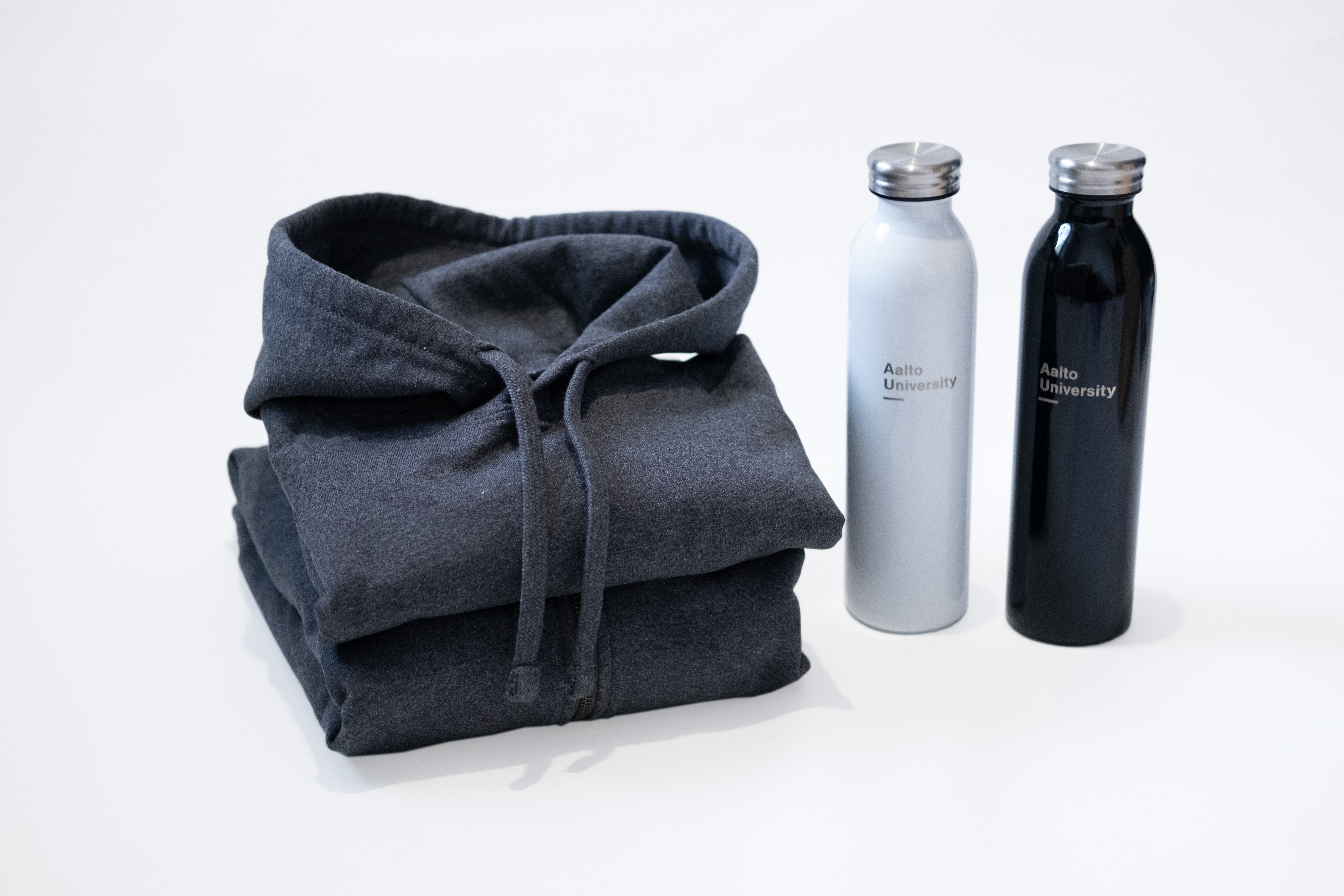 Vastaanottaja voi valita hupparin koon ja mallin sekä vesipullon värin noutaessaan tuotteet Aalto University Shopista.