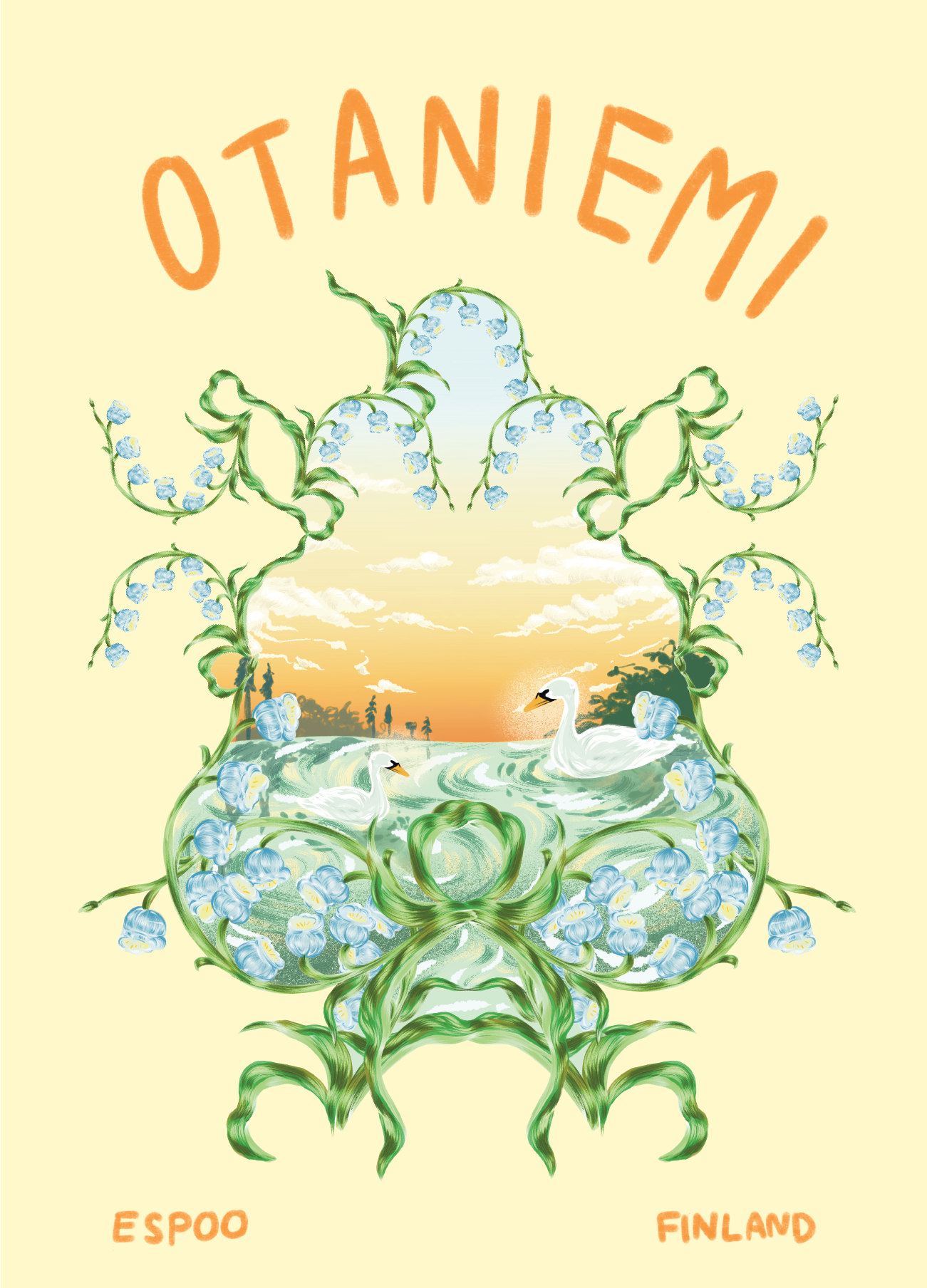 Suthasinee Naktnasukanjn'n suunnittelema Otaniemi-aiheinen postikortti.