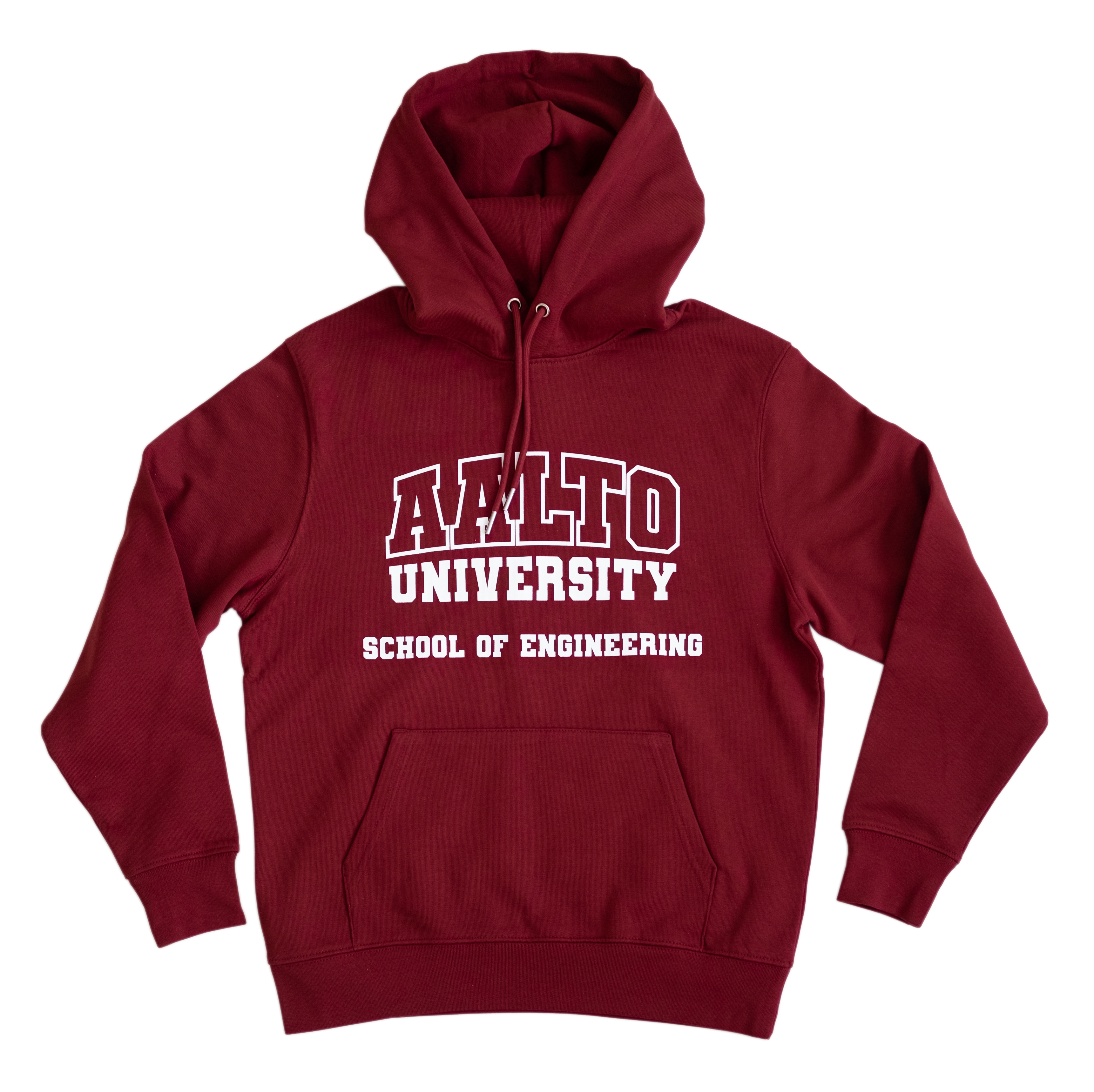 Luomupuuvillasta valmistettu huppari, jossa Aalto University School of Engineering -printti.